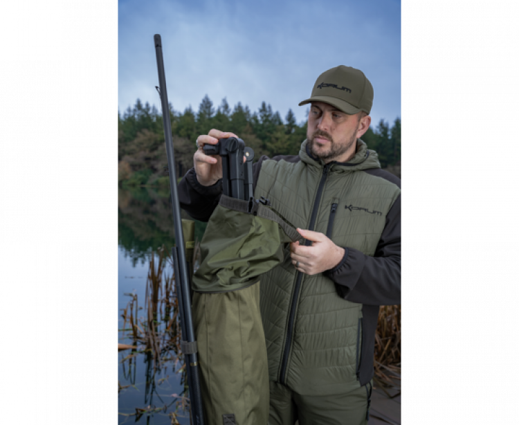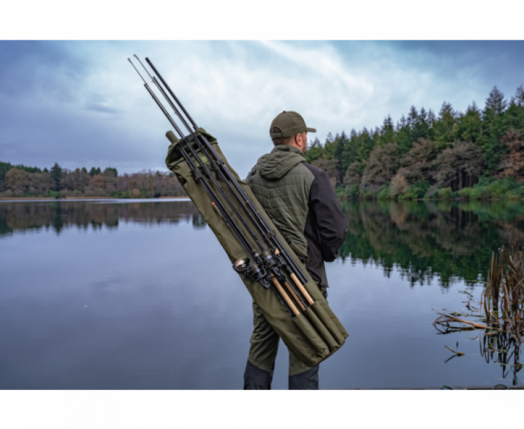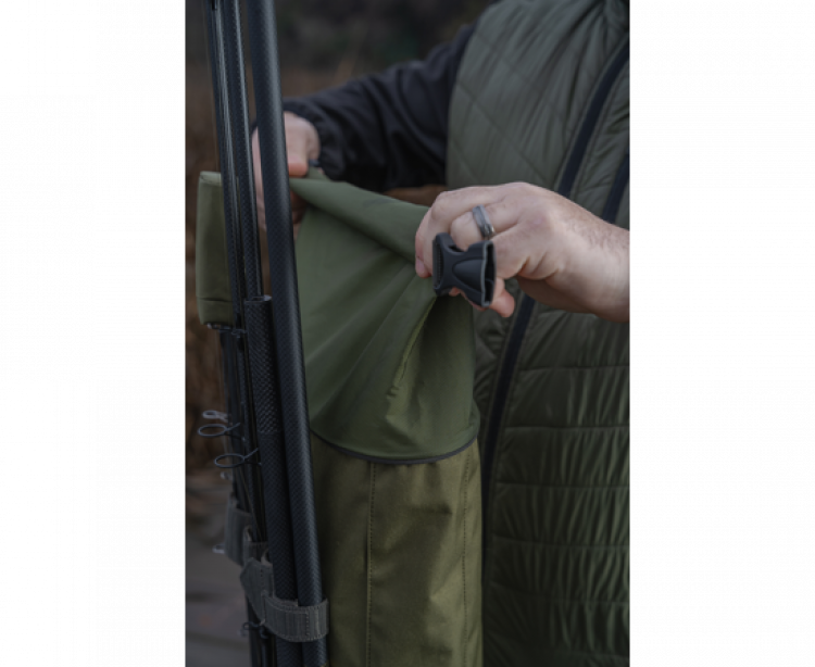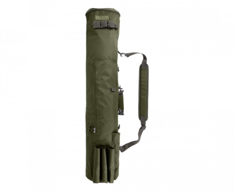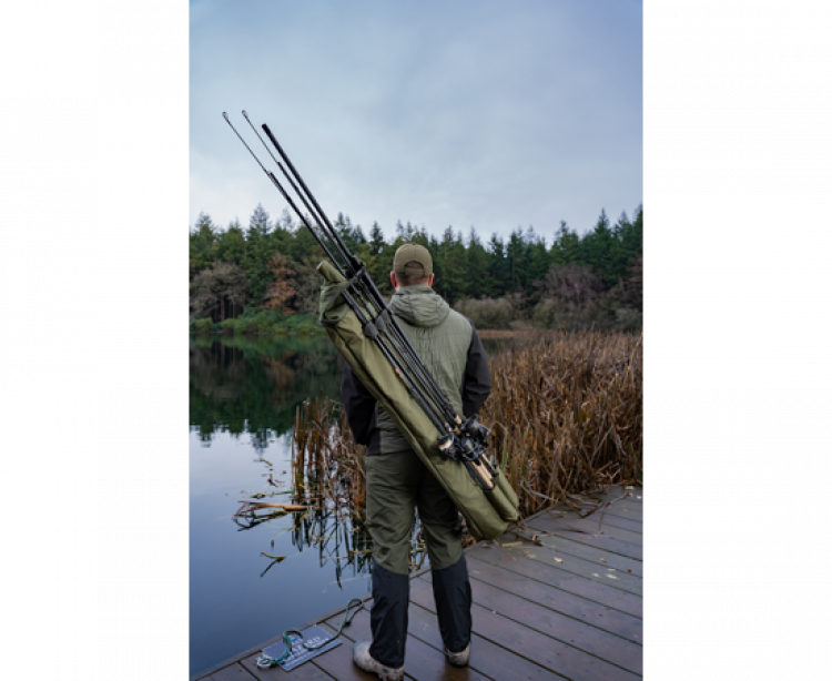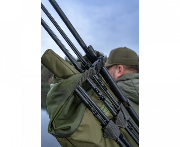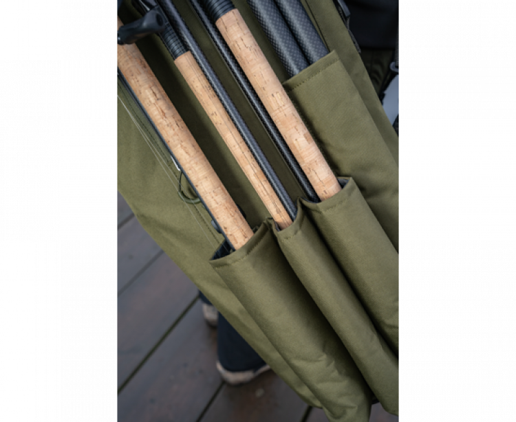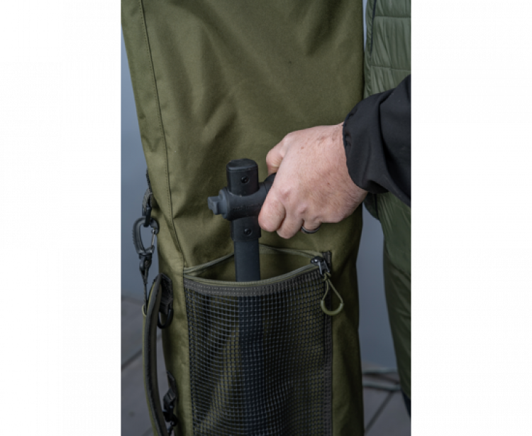 Pohodlně pojme tři pruty s dostatečnou vnitřní kapacitou pro brolly a přístřešky na noc. Přizpůsobeno pro vytvoření vlastního prostoru pro rukojeť podběráku. Obsahuje jednoduché vnější kapsy na nádobí a příslušenství k židli. Hlavní přihrádka má uzavíratelnou rolovací střechu. Odnímatelný a nastavitelný polstrovaný ramenní popruh pro pohodlné přenášení. 23 x 23 x 150