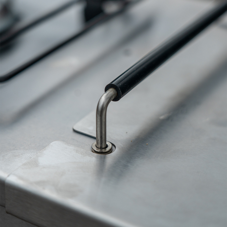 Pogumovaná podpěra pánví zajišťuje, že vaše nádobí zůstane vždy bezpečně v optimální poloze a bude sedět ve snadno čistitelné zapuštěné odkapávací pánvi. Dvojité pogumované rukojeti na bocích umožňují snadné přemisťování jednotky během používání a zároveň ji lze úhledně vysunout nebo zasunout, když není potřeba. Postranní stolek se jednoduše zasune na oba konce CookStation, v závislosti na vašich preferencích a prostorových požadavcích, a nabízí robustní, plochý a čistý rozšířený povrch pro skladování nebo přípravu jídla.