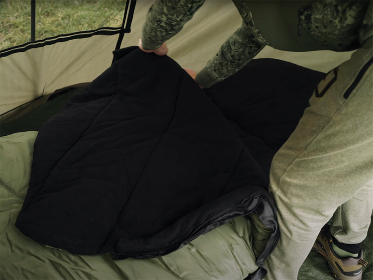 Vnější vrstva je vyrobena z odolného materiálu v zeleno-černé barevné kombinaci s efektním šikmým prošíváním. Vnitřní část tvoří mikrofleece černé barvy. Ten je na dotek velmi příjemný, což vám zaručí opravdu pohodlný spánek za jakýchkoliv okolností. Mezi těmito dvěma tkaninami je vrstva z hřejivého mikrovlákna, pečující o vysoký tepelný komfort i v chladných obdobích roku. Velkou výhodou je zipovatelná kapsa pod hlavou, určená pro vložení polštáře v případě potřeby.