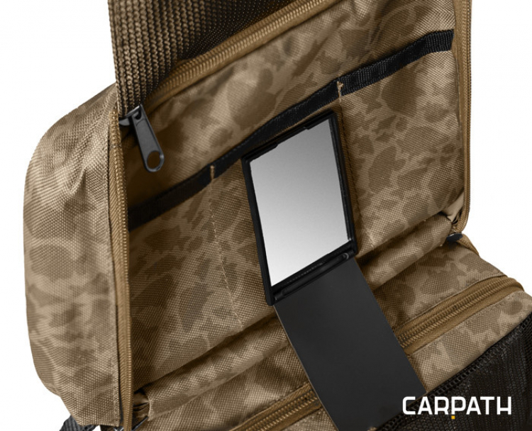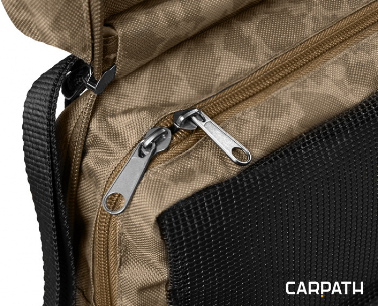 Taška je vybavena kvalitními zipy. Vnější zipy jsou vybaveny plastovými taháčky, které jsou na konci rozšířeny, a proto je možné je jednoduše uchopit a tašku rychle otevřít. Design tašky doplňuje naše jedinečná hnědá Carpath kamufláž se siluetami kaprů.