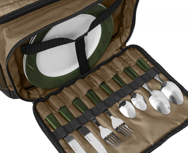 V přední části je velká kapsa, ve které je umístěna kompletní jídelní sada pro dvě osoby. Obsahuje dva kusy plastových talířů, dva nože, dvě vidličky, dvě lžíce a dvě malé dezertní lžičky. Odteď si můžete dopřát více komfortu, i když jste u vody se svou polovičkou nebo parťákem!
